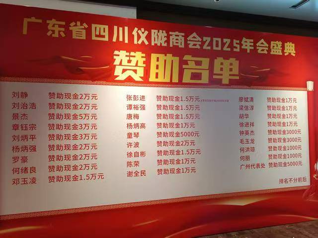 当晚10时许,年会在《明天会更好》的悠扬歌声中圆满落下帷幕。本次年会不仅是一场乡情交融的温馨聚会,更是一次凝聚共识、共绘蓝图的重要盛会。会员们的慷慨赞助彰显了团结本色,社会各界的大力支持指明了前进方向。未来,广东省四川仪陇商会将继续秉持“服务会员、凝聚乡情、共谋发展”的宗旨,发扬仪陇商人“艰苦奋斗、敢闯敢拼”的精神,在服务会员企业、助力家乡建设、深化粤仪协作等方面持续发力,共同书写区域共赢与商会发展的崭新篇章。